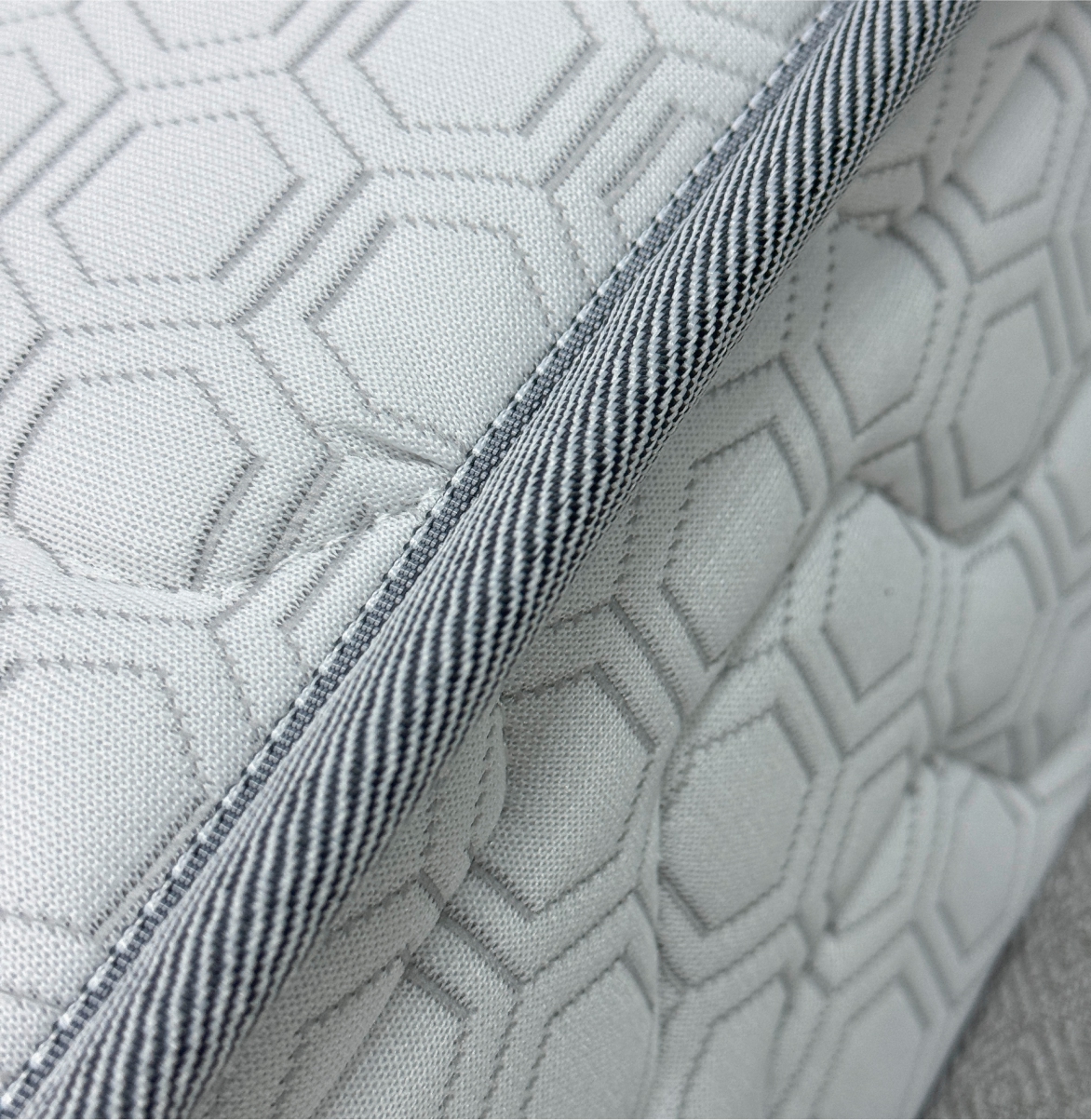 Трикотаж «Carbon» — современный и стильный материал с оригинальным рельефным рисунком «соты», который придаёт матрасу эффектный и премиальный вид. Высокая плотность ткани гарантирует её прочность и долговечность, а эластичная структура обеспечивает идеально ровное прилегание к наполнителю, сохраняя гладкость поверхности на протяжении всего срока службы. Материал обладает хорошей воздухопроницаемостью, что помогает поддерживать комфортный микроклимат во время сна, и устойчив к износу, сохраняя свой внешний вид даже при длительной эксплуатации